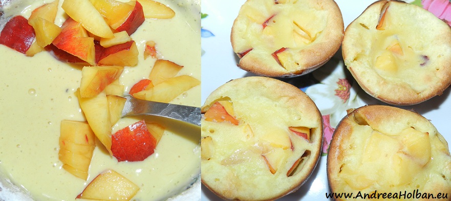 Se amesteca bine toate ingredientele dupa care se adauga in forme de briose, unse cu unt (cam pana la jumatatea formei, pentru ca mai cresc putintel).