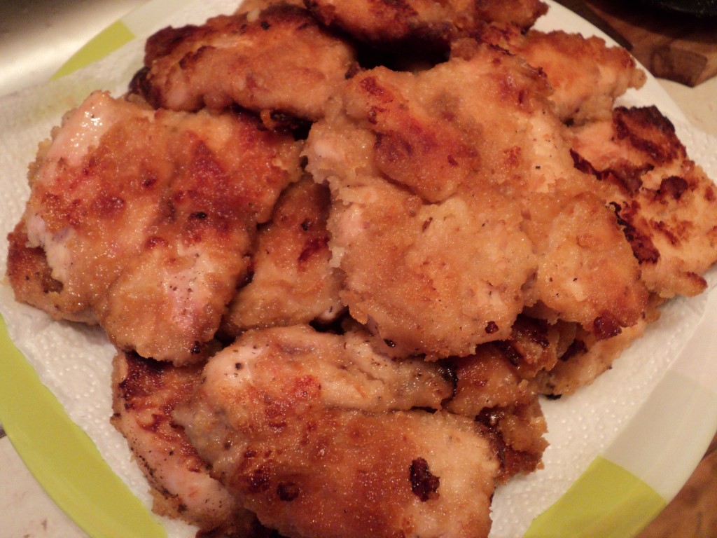 Am inceput sa pregatesc puiul: dupa ce am trecut fasiile de pui prin mierea de albine, le-am dat prin faina de grau mai intai si apoi prin pesmet si le-am pus in tava. Am repetat operatiunea cu toate fasiile de piept de pui, dupa care le-am stropit cu ulei in tava.