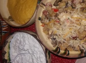 Dezmat culinar la tigaie: ciuperci, cabanos, cartofi, telemea si sos alb...