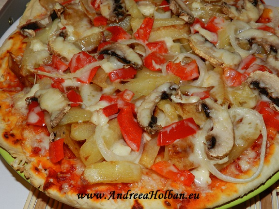 Pizza cu ciuperci, cartofi prajiti si ceapa