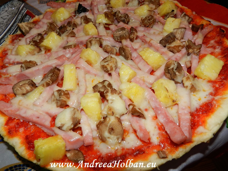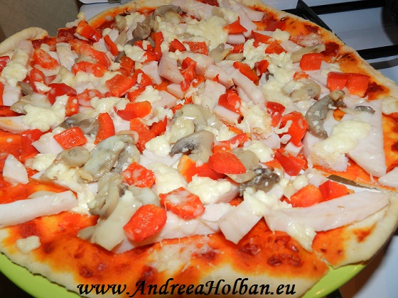 Pizza cu sunca de pui, ciuperci si branza de burduf