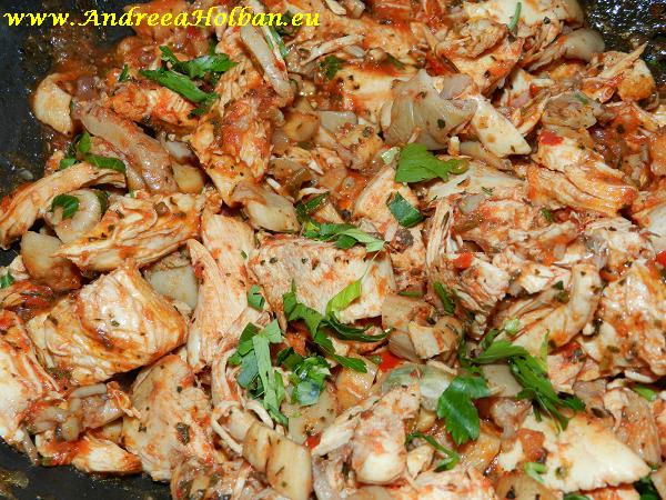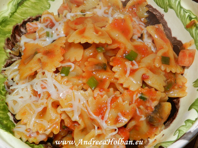 Penne cu ciuperci, usturoi, busuioc si sos de rosii