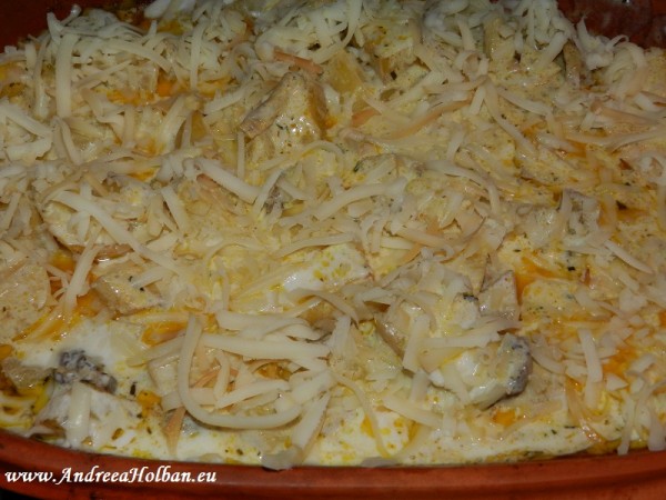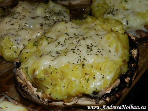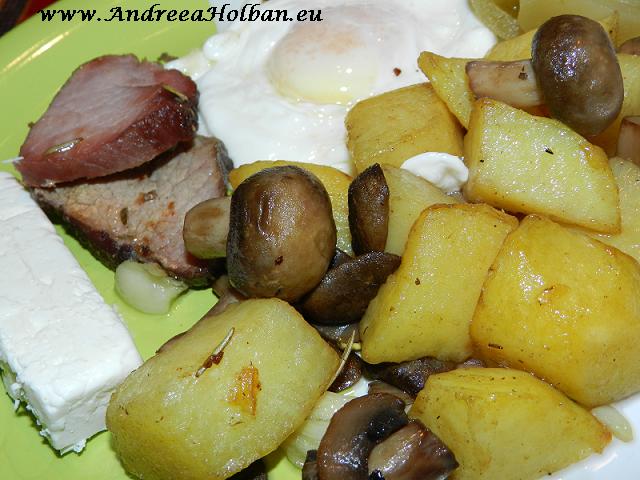 Cartofi cu ciuperci, telemea de capra, ou si muschi afumat