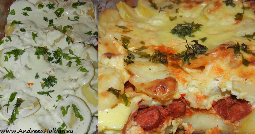 Se curata cartofii si se taie felii, cam de grosimea unui deget (1-2 cm). Se pun la fiert in apa.