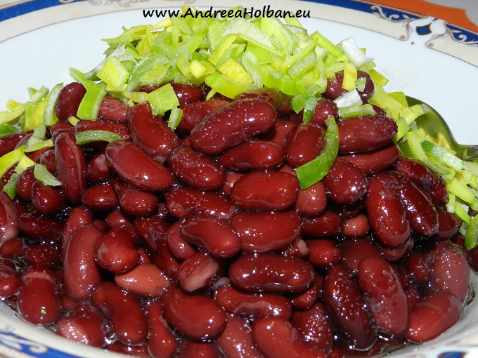 Se iau 2 conserve de fasole boabe – rosii, carnoase, se scurg si se pun intr-un bol. Se adauga o mana sanatoasa de praz tocat, sare, piper, ulei si putin otet (simplu sau balsamic – dupa gust).