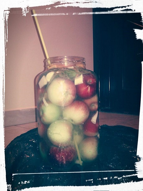 Se pun intr-o budanica sau intr-un borcan. In mijloc se pun ardeii iuti, iar printre mere se adauga rondele de morcov si telina si crengute de cimbru.