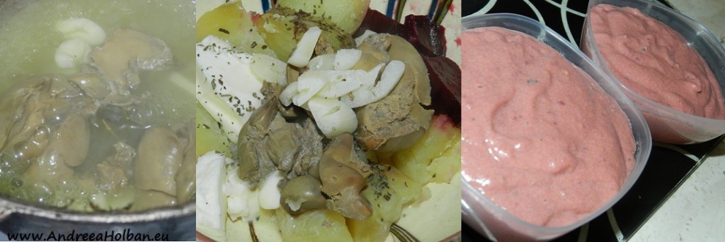 Intr-un bol se pune o bucata de sfecla rosie – cam cat sa incapa intr-o lingura de ciorba, un cartof potrivit, 2 bucatele de ficat, 2 catei de usturoi, putina zeama din care a fiert ficatul ultima data, oregano, 2 linguri de unt si cativa stropi de ulei de masline (daca bebe are peste 1 an se mai poate adauga si un strop de sare).