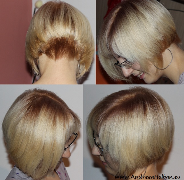 Eii si atat i-a mai fost pletoseniei, pentru ca dupa nunta (unde am avut un coc impecabil care a stat perfect la locul lui pana dimineata si daca era dupa el, ar mai fi stat si inca vreo 2 saptamani, probabil; eu oricum am fost foarte incantata de machiaj, care de asemenea a rezistat cu brio, la toate pupaturile, topaielile, etc. pana dimineata), am revenit la doamna Adriana care a inceput operatiunea “curatenia si resuscitarea podoabei mele capilare”. Si dintr-o blonda cu par lung (ars de vopsele proaste si de permanentul buclat) am ajuns, in prima faza, o satena cu parul scurt, cu breton (stiu, nu prea semanam cu cea cu care s-a casatorit oficial al meu sot, dar viata cere sacrificii), apoi rand pe rand tot felul de tunsori si de nuante (mai putin brunetul netestat).